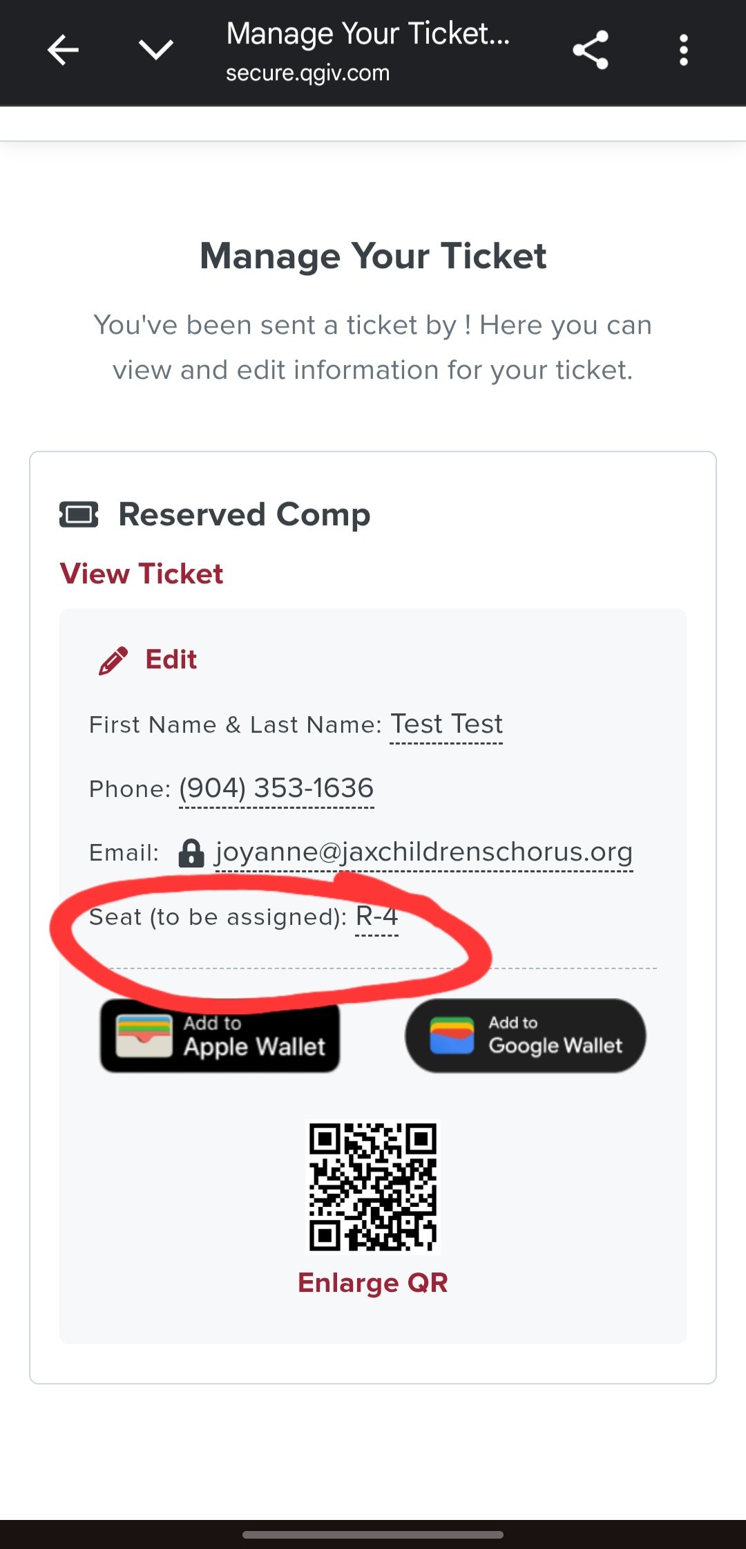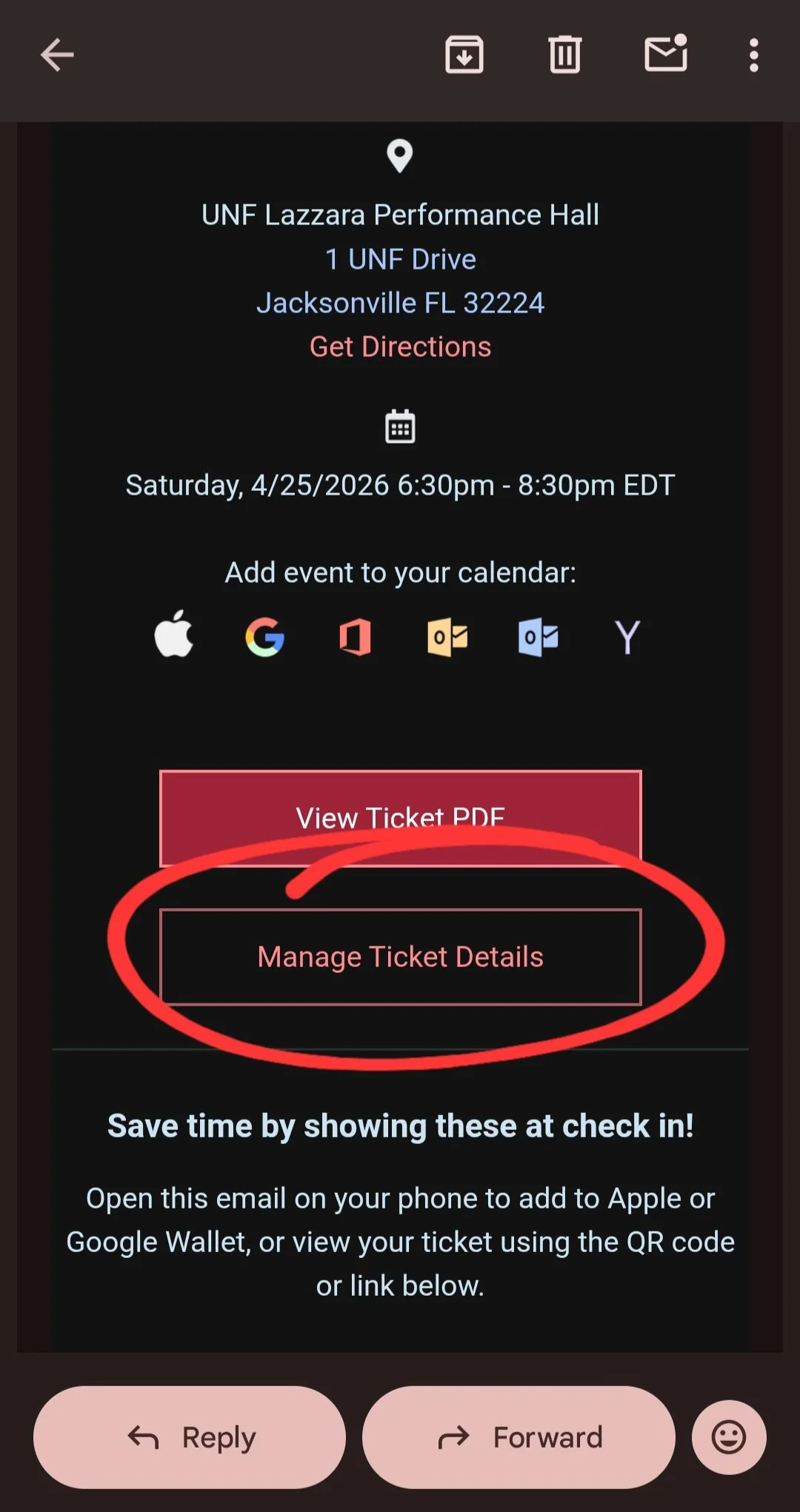 Click on "Manage Ticket Details" in your ticket email: