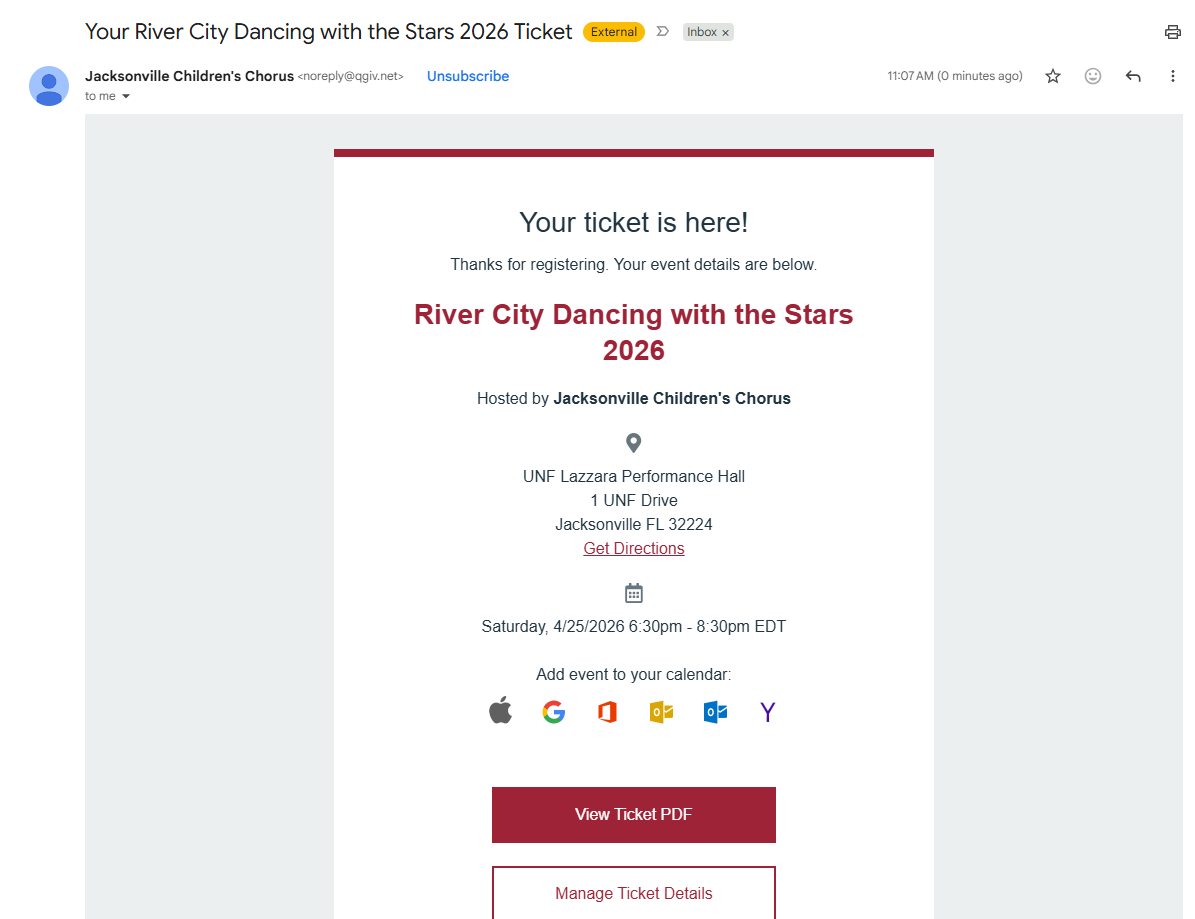 Tickets are completely digital this year. At the time of purchase, you should have received a confirmation email with your receipt and a separate email containing your QR code. Please have your QR code ready for entry. If you do not see your ticket email, be sure to check your Promotions or Spam folder with the subject: Your River City Dancing with the Stars 2026 Ticket An example of the ticket email is included below for reference.